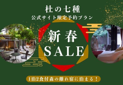 広大な8,000坪の敷地に佇む「 ぶどうの樹 杜の七種」。趣が異なる客室はすべて離れでジャグジー完備。