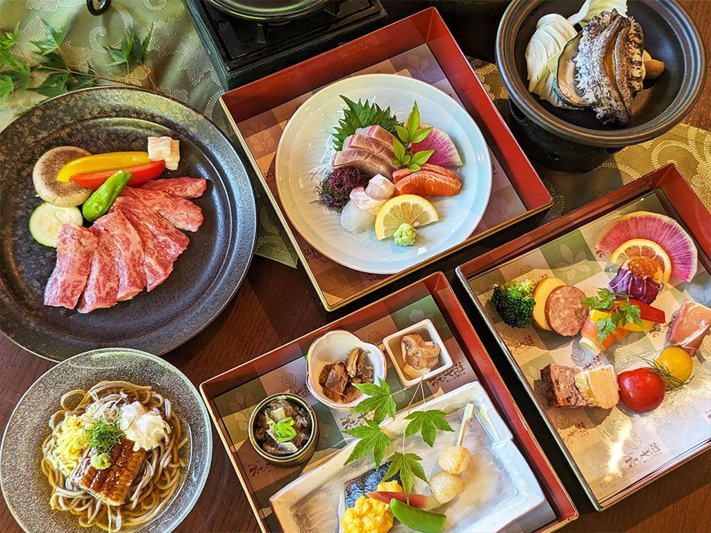 季節の前菜やお造り、活き鮑の陶板焼き、お肉料理、季節の一品など、旬の美味しいが詰まったお重の玉手箱をお部屋にお持ちします。
